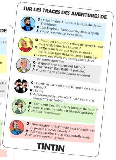 Le dé « Personnages » comporte un personnage célèbre de l’univers de Tintin. A chacun correspond une catégorie de questions, identifiée sur les cartes